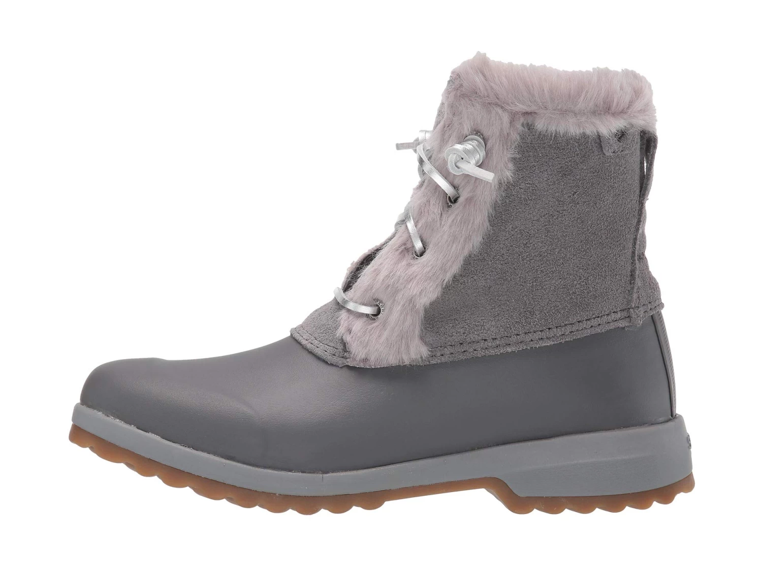 - Water-resistant suede upper with faux-fur trim and rubber shell.