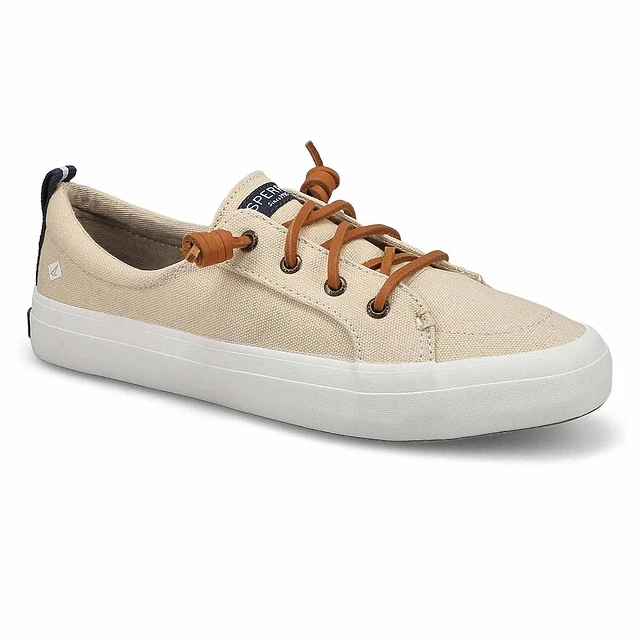 Stay adventure-ready as you hit the sea while wearing the Crest Vibe Linen oat fashion sneaker from Sperry Top-Sider. With a removable, polyurethane molded footbed, this lightweight shoe provides comfort and arch support for confident strides. Rawhide fixed laces with rustproof eyelets. Vulcanized construction with secure bond between upper and outsole.